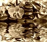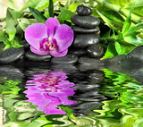 Spa concept with zen stones, orchid flower and bamboo reflected in a water