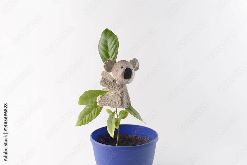 Handmade koala figurine sitting on green plant in plastic pot on a white background. Minimalist paper craft design with nature theme. creativity and recycling concept, DIY art or craft project