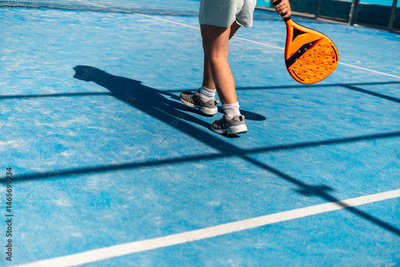 Sports action on a bright blue court with orange racket.