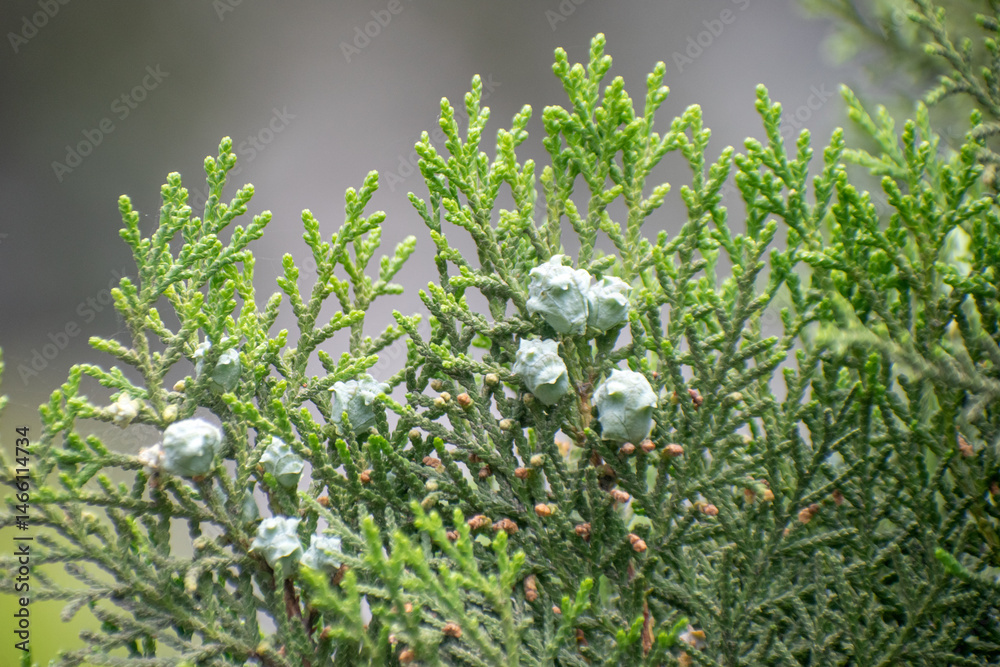 Green oriental arbor vitae foliage with blue berries on natural branches.