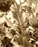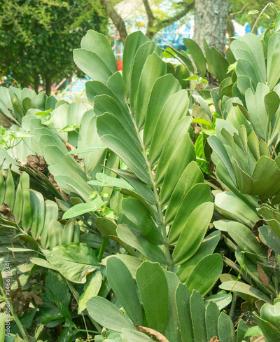 Green cardboard cycad leaves thriving in a sunlit garden with vibrant surroundings.
