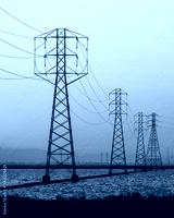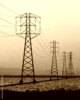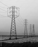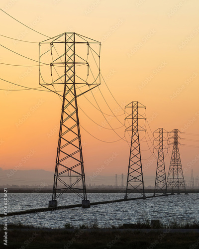 High Voltage Power Lines at Sunset. Sunnyvale Baylands, Santa Clara County, California, USA.
