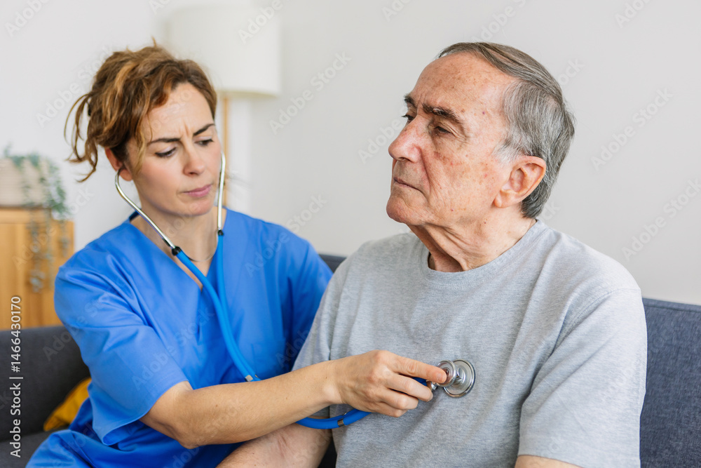 Young female doctor in blue scrubs listening to older patient heart sound with stethoscope during visit at home. Medical checkup and healthcare concept