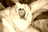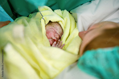Newborn baby wrapped in blankets after birth. Mother looking for the first time on new born daughter. Newborn child seconds and minutes after birth. Happy mum crying