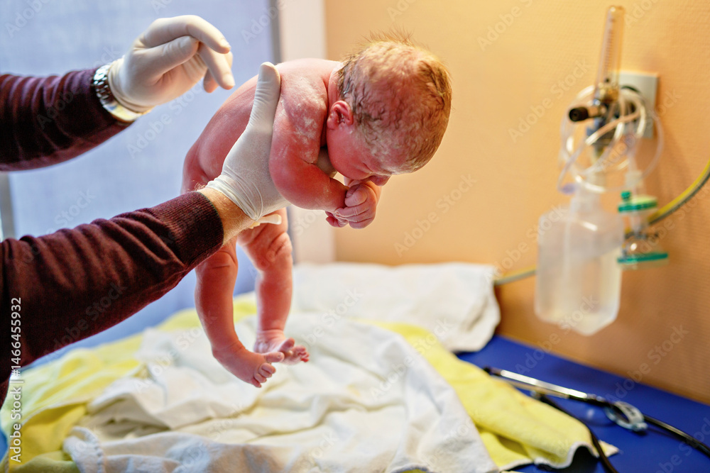 Newborn child seconds and minutes after birth. Doctor hands with new born baby. Medical check up of health and reflexes of child. New life, beginning, healthcare
