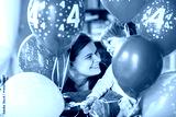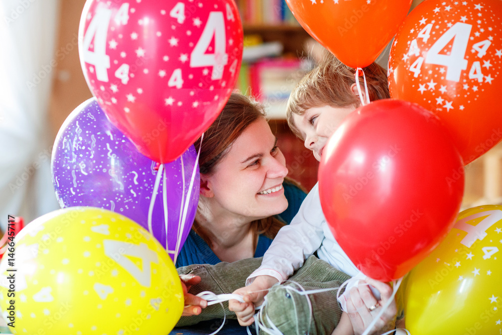 Happy little boy and mother celebrating his 4 birthday with colorful balloons. Adorable child and young woman hugging and having fun.