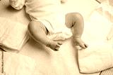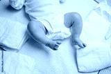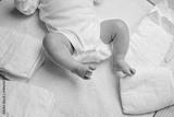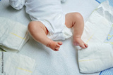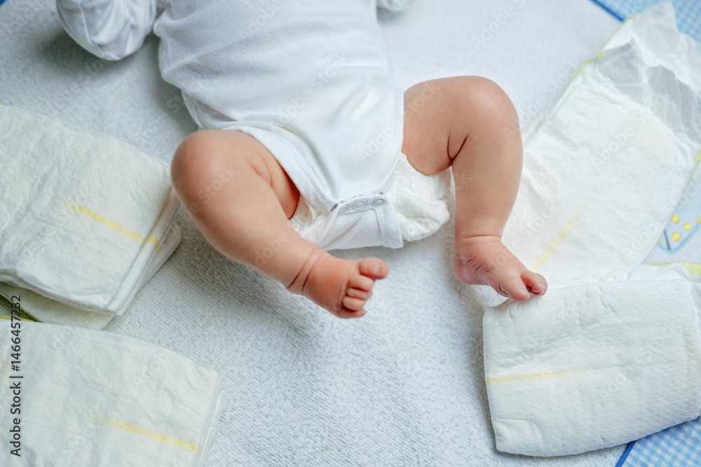 Feet of newborn baby on changing table with diapers. Cute little girl or boy two weeks old. Dry and healthy body and skin concept. Baby nursery.