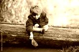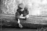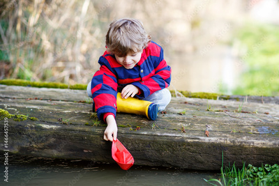 Happy little kid boy in yellow rain boots playing with paper ship boat by huge puddle on spring or autumn day