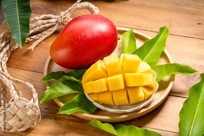 Fresh Red Mango fruit in Bamboo basket on wooden table in garden, Organic Fresh Red Mango with mango cube on blurred greenery background.