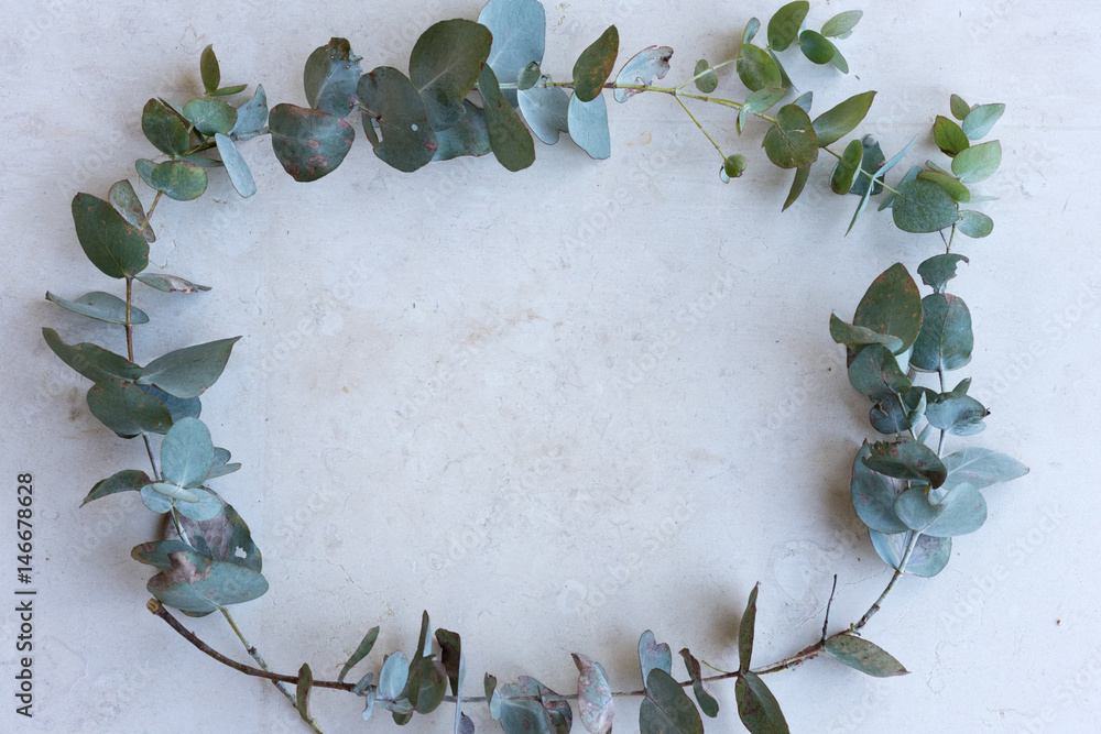 High angle view of eucalyptus leaves arranged in a circle on limestone background - nature background