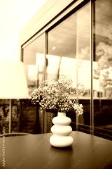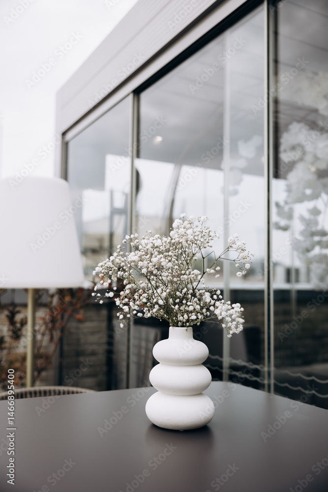 A white flower arrangement in a vase is on the table