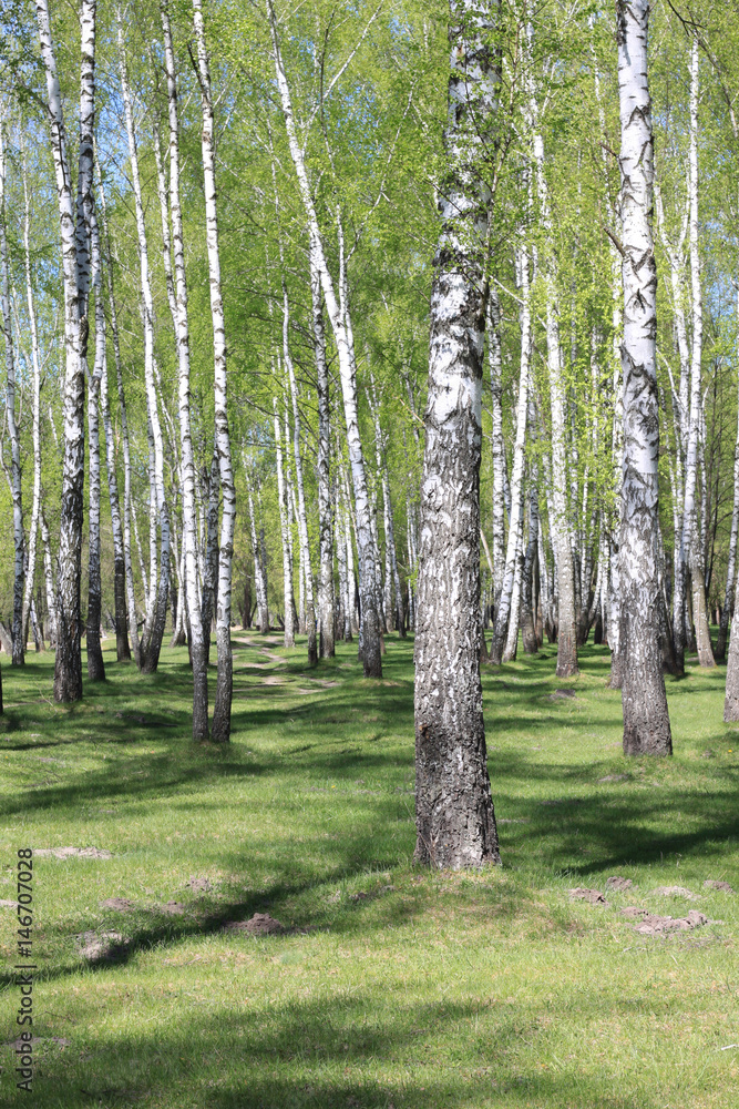 Beautiful landscape with young juicy green birches with green leaves and with black and white birch trunks in sunlight in the morning in spring