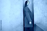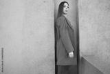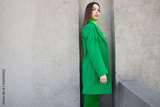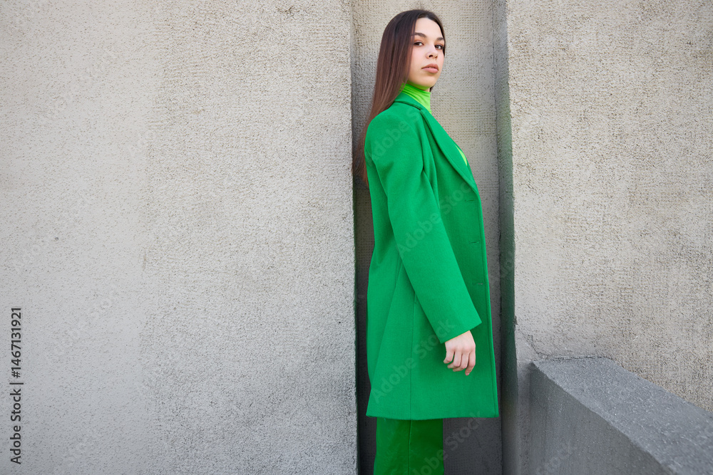 High fashion photo of a young brunette woman in green coat, poloneck and leather pants.