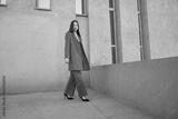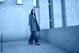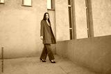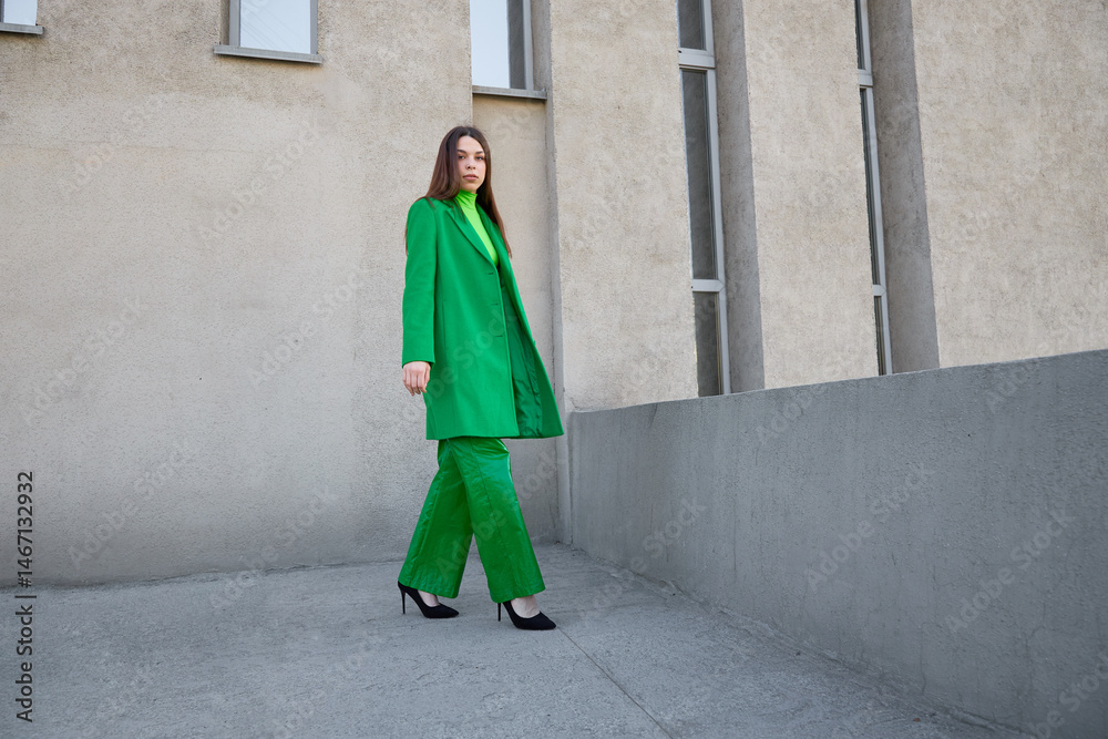 High fashion photo of a young brunette woman in green coat, poloneck and leather pants.