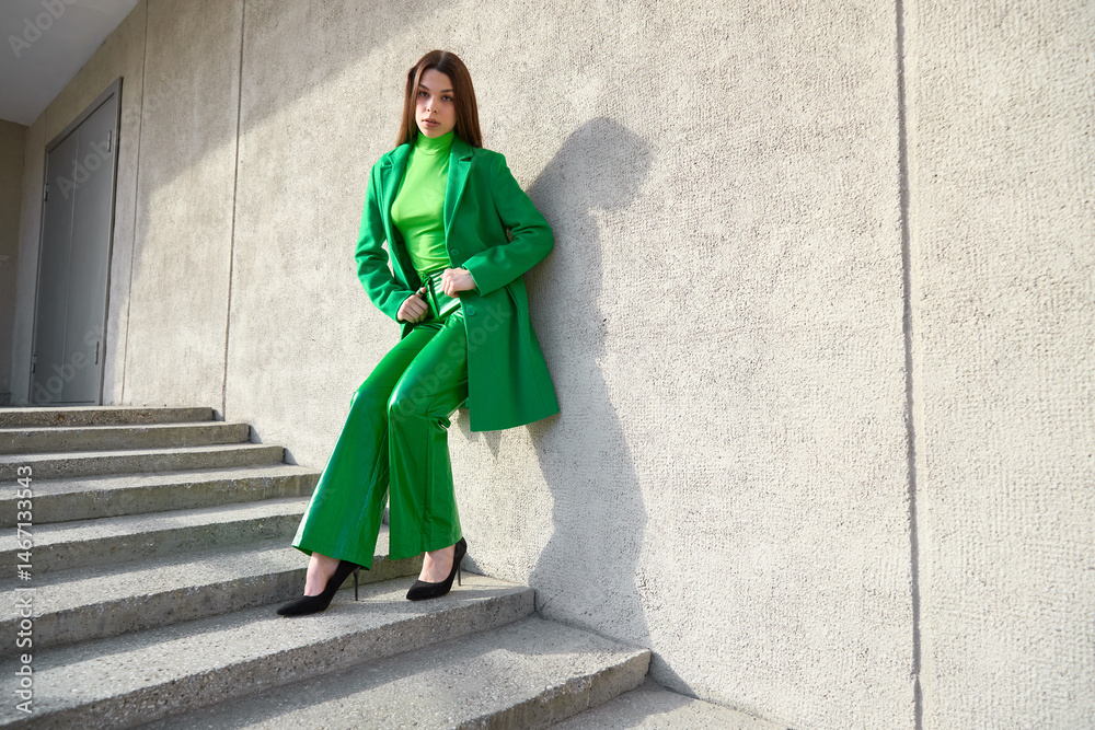 High fashion photo of a young brunette woman in green coat, poloneck and leather pants.