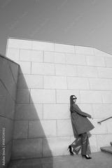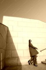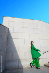 High fashion photo of a young brunette woman in green coat, poloneck and leather pants.