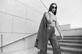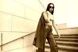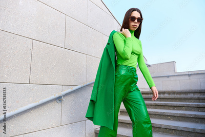High fashion photo of a young brunette woman in green coat, poloneck and leather pants.