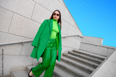High fashion photo of a young brunette woman in green coat, poloneck and leather pants.