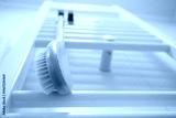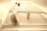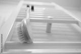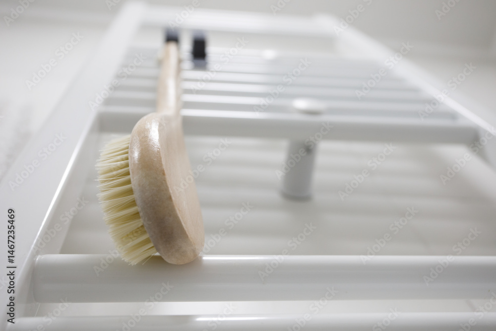Wooden brush for dry brushing massage hanging on heated towel rail