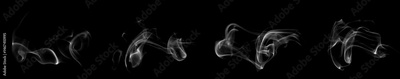 Close-up photo set of incense smoke or abstract white vapor floating on black background. Fog and clouds effect for air pollution design. Smog element.