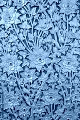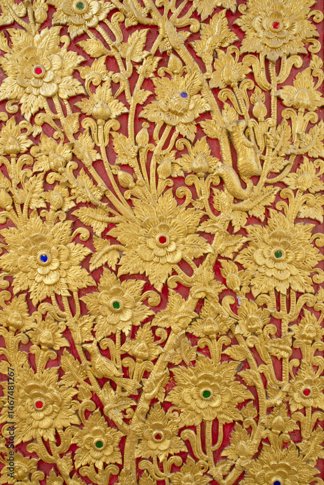 Golden stucco art of flowers on the wall in a Thai temple
