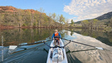rowing scenery from a calm lake at foothills of Rocky Mountains with a senior rower