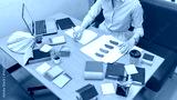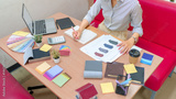 Asian Woman Interior Designer Brainstorming Color Palettes, Fabric Samples, and Furniture Designs for a Home Renovation Project