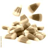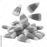Colorful candy corn scattered on a white background during Halloween season