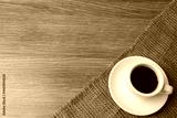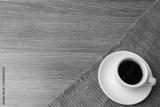 Hot coffee in a white coffee cup and many coffee beans scattered around