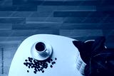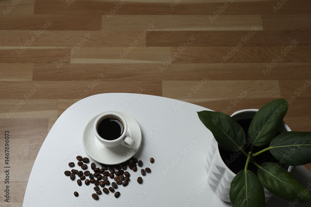 Hot coffee in a white coffee cup and many coffee beans scattered around