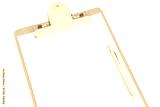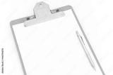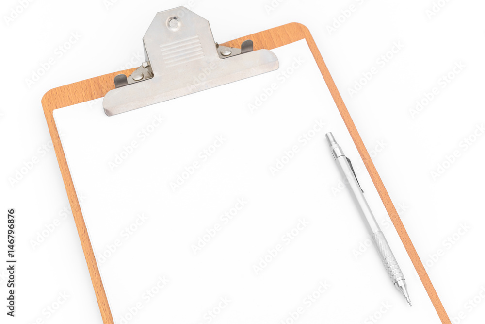 White paper, clip board and pencil on white background