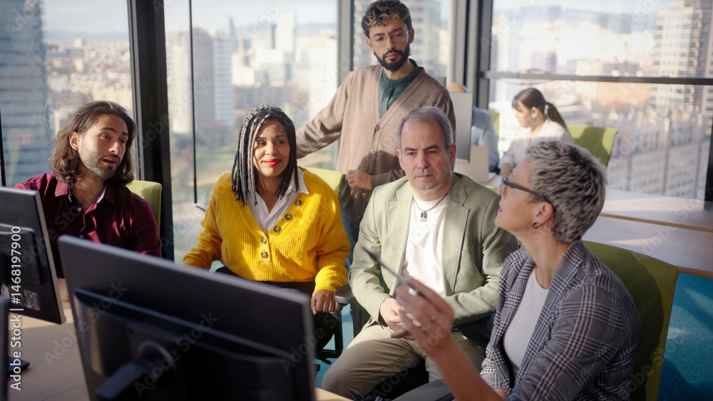 Diverse professional team analyzing complex business data while collaborating near computer, city skyline visible through expansive office window during strategic meeting