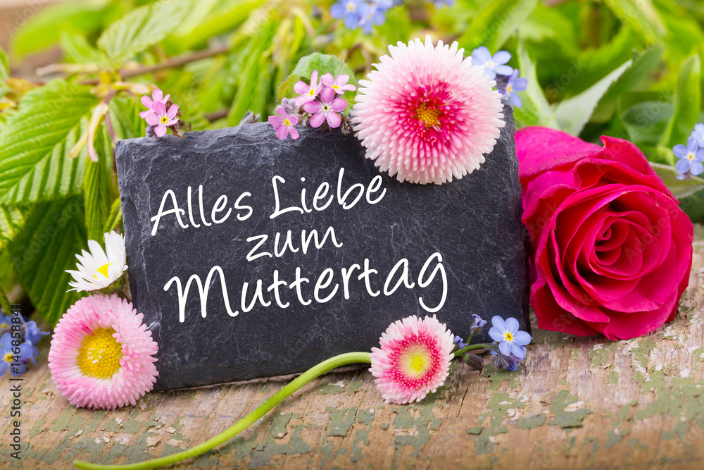 Alles Liebe zum Muttertag - Schiefertafel und Blumen auf rustikalem Holz