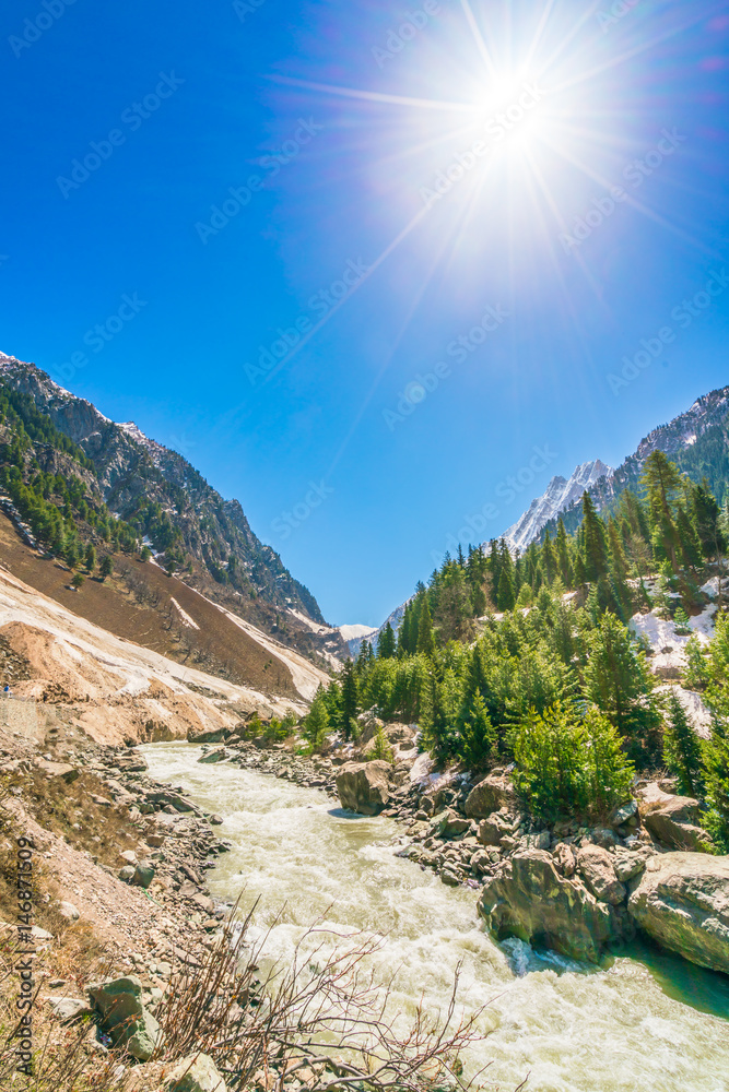 Beautiful River and snow covered mountains landscape Kashmir state, India .