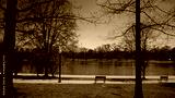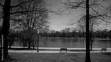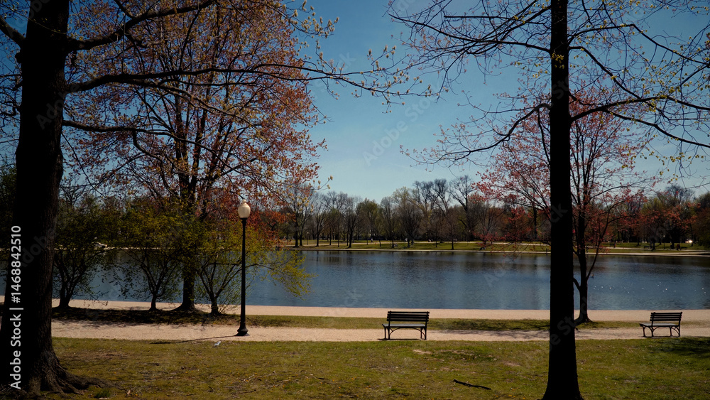 Two empty benches facing the calm lake at Constitution Gardens in Washington DC on a beautiful spring day