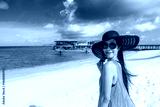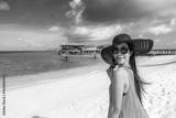 Portrait of happy young woman at beautiful water villa at Maldives island. Travel and Vacation. Outdoor shot.