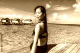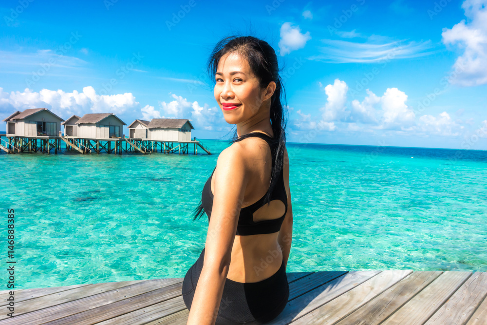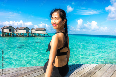 Portrait of happy young woman at beautiful water villa at Maldives island. Travel and Vacation. Outdoor shot.