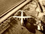 Aerial photography of an old Soviet cargo plane parked in a green field next to a road in a rural area.