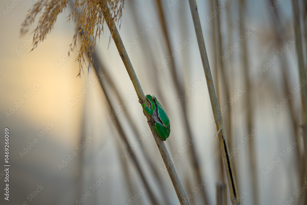 Green tree frog clinging to reed in soft golden light with shallow depth of field