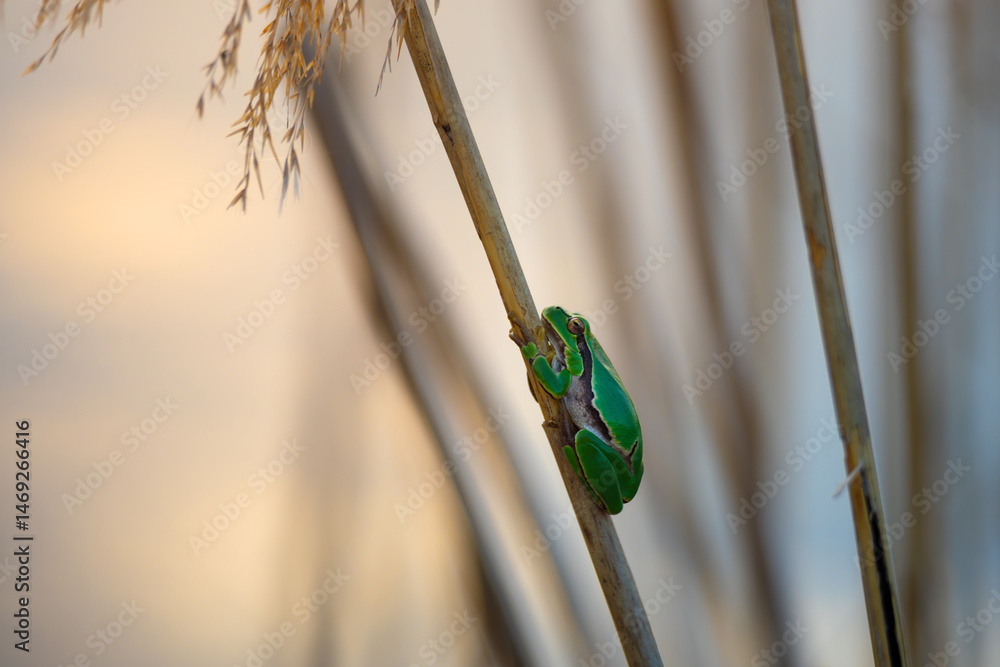 Green tree frog clinging to reed in soft golden light with shallow depth of field