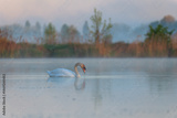 White swan gliding through misty lake at sunrise with soft morning light and reflection
