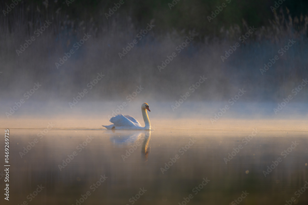 Swan gliding through misty lake at sunrise with golden light and reflection