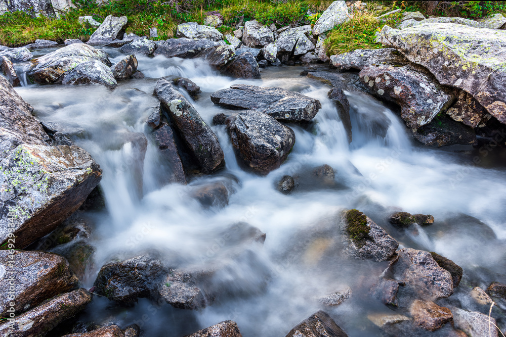 Waterfall in the forest. Close-up of a mountain stream with crystal-clear water flowing between moss-covered rocks. Perfect for projects about nature, water, and serenity. GR11, Posets-Maladeta.
