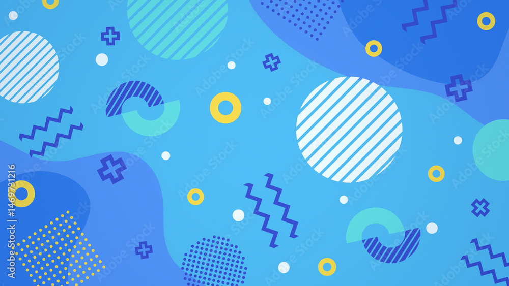 メンフィス風の図形や模様が並ぶポップな平面構成 - ブルー