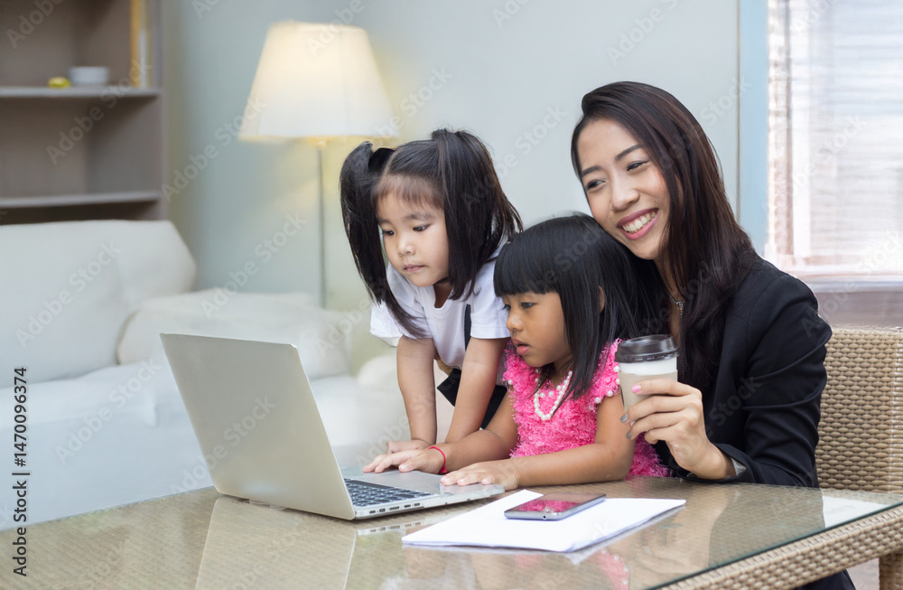 Female teacher assisting two diverse students (one dark-skinned, one Asian) with online learning on a laptop. Education, technology, inclusivity, and learning concept