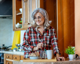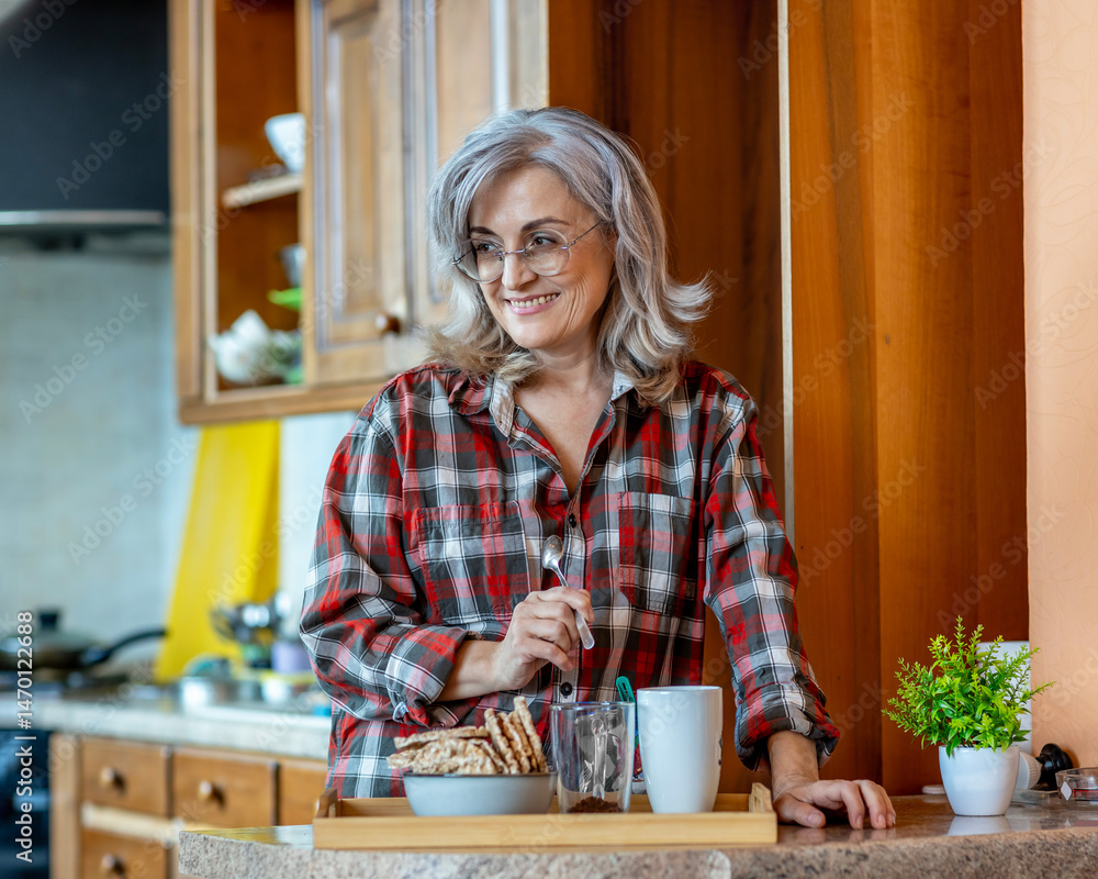 Beautiful elderly woman preparing breakfast in the kitchen in the morning