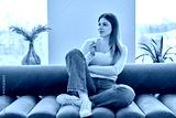 Portrait of relaxed beautiful young woman sitting at home on sofa with cup