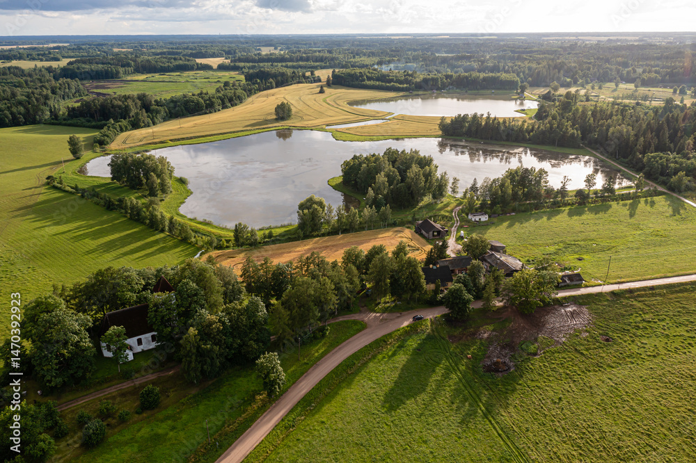 Vast green fields and serene lakes reflecting clouds in a tranquil rural landscape