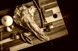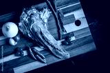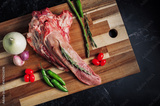 Lengua de res cruda sobre tabla de madera acompañada de jitomate cherry, esparragos, chile, ajos y cebolla