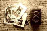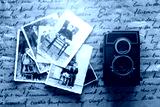 Studio shot of old vintage photo camera with pictures on wooden background